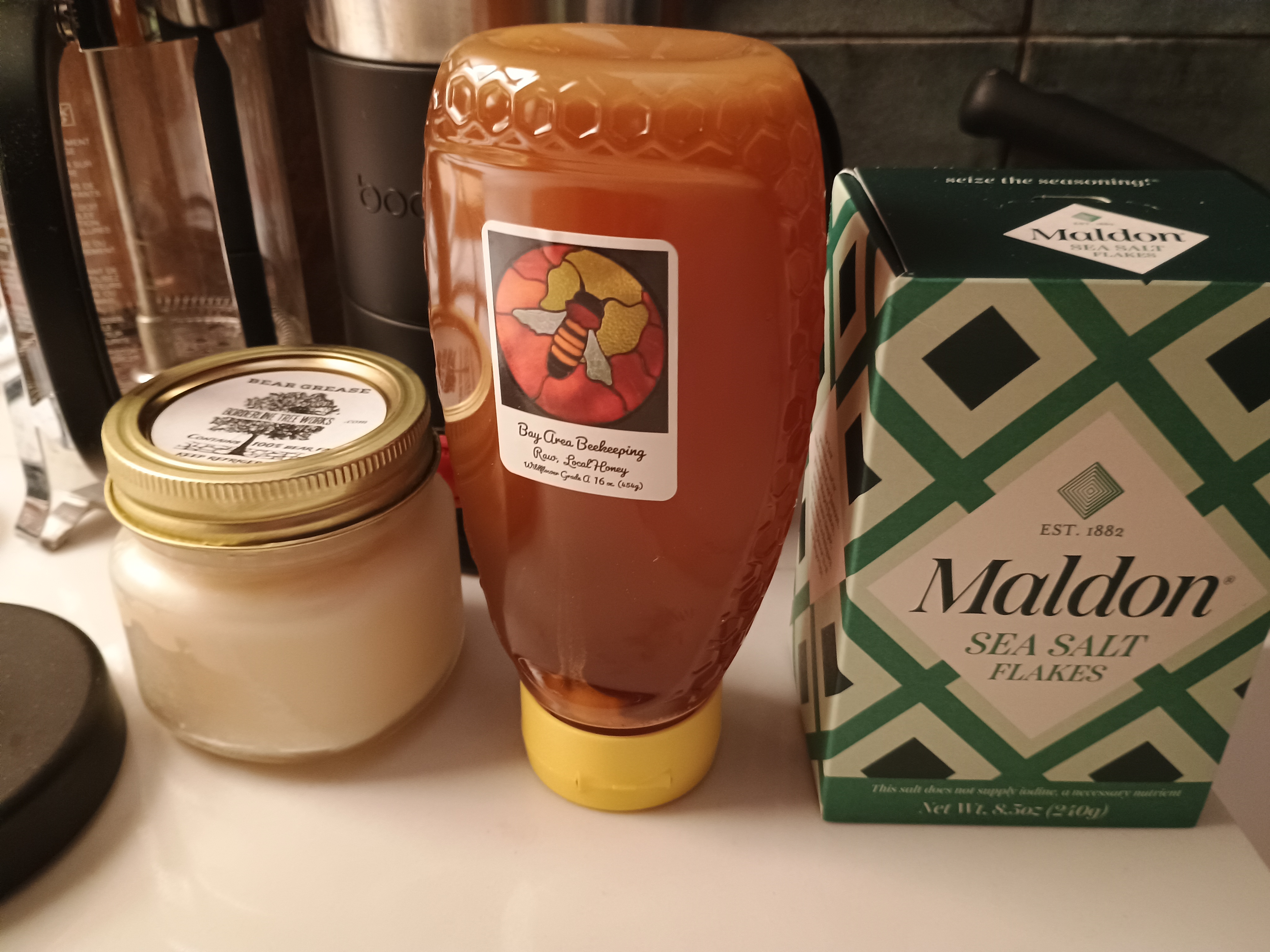 如果你不像我一样对这道菜那么执着,或许可以用熊油的替代品。鸡油的质地差不多,虽然肉味略有不同。加热后的牛油或许能带来最接近的口感,或者也可以将牛油与液态油混合。如果你是素食主义者,可以用液态油与澄清黄油混合;如果你不吃肉和奶制品,但吃蜂蜜,可以用椰子油。理想的做法是,油脂在温暖的房间里能融化,但从冰箱里拿出来就能直接涂抹。片状盐和蜂蜜在高档超市应该很容易买到。