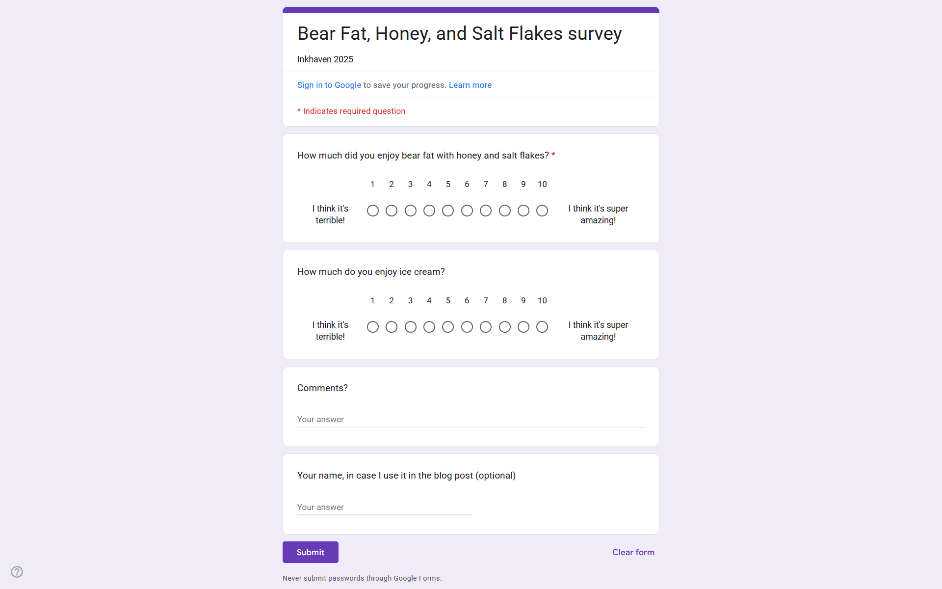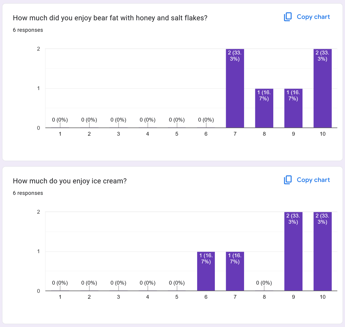 大约有十个人到场,其中六人填写了我的调查问卷。他们的反应各不相同,但总体上是积极的,大致从“这很有趣,谢谢分享”到“这食物太棒了,应该到处都有”。两位受访者(Jenn 和 Skyler)甚至认为熊油零食比冰淇淋更美味,而另一位受访者(A,要求匿名)则认为两者并列第一,都是10分。所有填写问卷的人给出的评分都高于7分。Gwern 之前写过关于食用和享用肉干的文章,他也非常喜欢这种食物。他建议除了搭配面包和饼干之外,还可以有更好的食用方式——比如像北极美食akutaq(又名“爱斯基摩冰淇淋”)那样打成泥状。