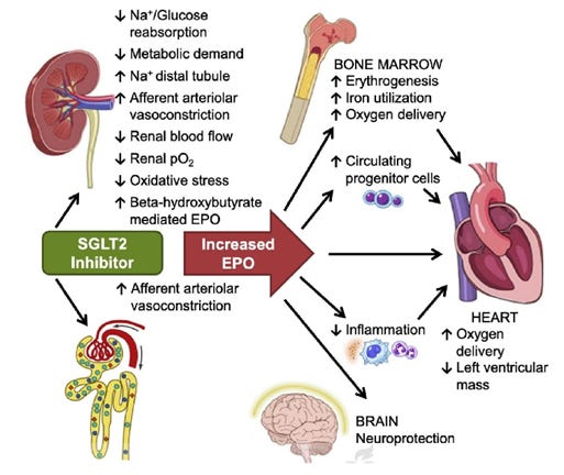 对我来说,SGLT-2抑制剂的卖点在于它们对EPO调节的影响。由于其复杂的机制,SGLT-2抑制剂可以提高EPO水平,从而增加红细胞计数。因此,SGLT-2抑制剂是一种安全有效的提高血细胞比容的方法。