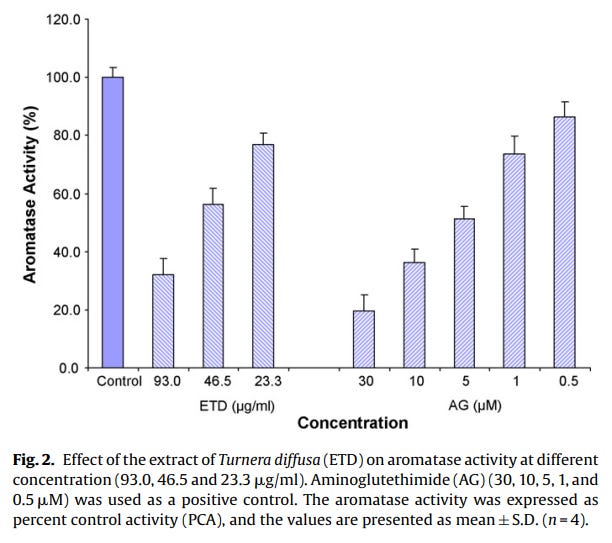达米阿那(Turnera diffusa )传统上被用作催情剂,但现代研究表明它也可能具有天然芳香化酶抑制剂的作用。在实验室测试中,达米阿那的甲醇提取物表现出剂量依赖性的芳香化酶抑制作用,IC₅₀ 为 63.1 μg/mL ( R )。