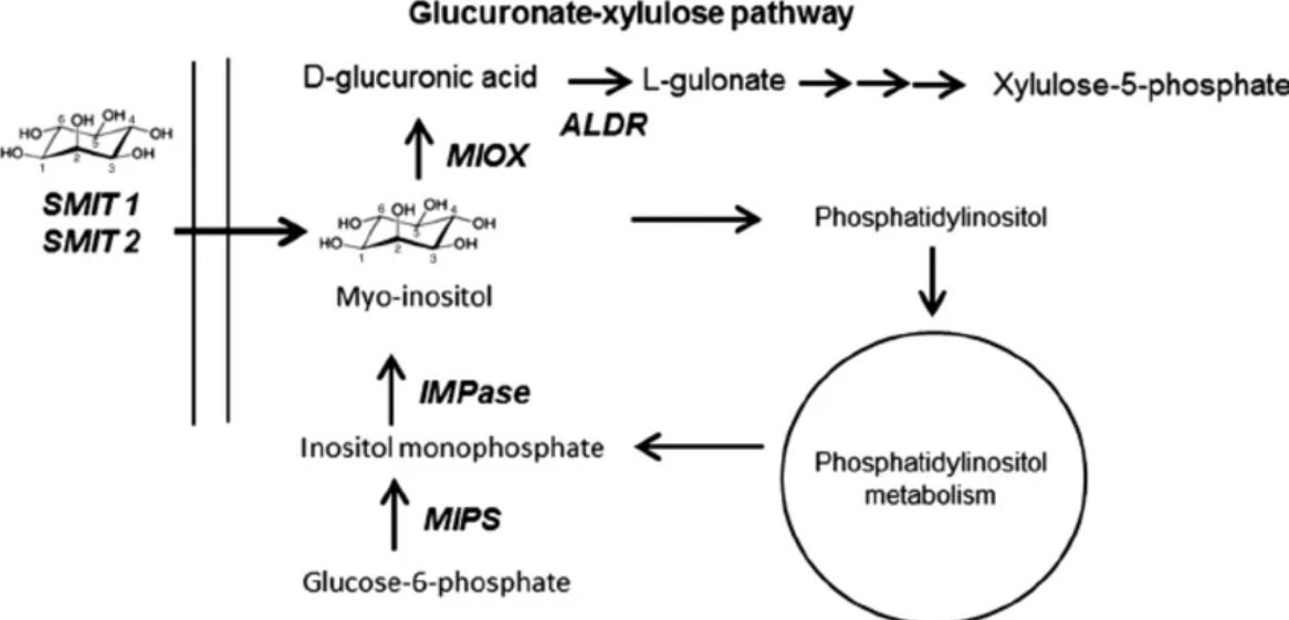 人体也能从饮食中吸收肌醇,主要在小肠中,利用钠依赖性转运蛋白,如SMIT1和SMIT2 。