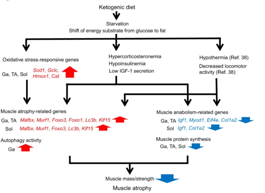 这项动物研究表明,在生酮饮食喂养的小鼠的骨骼肌中,肌肉萎缩相关基因 Mafbx、Murf1、Foxo3、Lc3b 和 Klf15 上调。根据 Igf1 等合成代谢基因的表达降低,对快肌 Ga、TA 和 Sol 肌肉的表面翻译感知 (SUnSET) 分析显示 KD 抑制肌肉蛋白质合成……除了高皮质酮血症、低胰岛素血症和 IGF- 1,氧化应激也可能参与 KD 诱导的肌肉萎缩。” ( R )