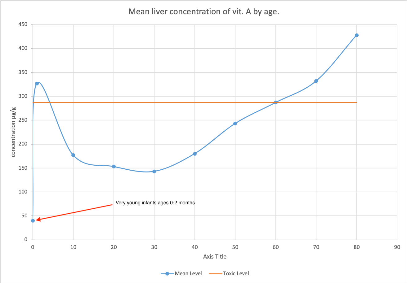现在,将该图表与我在COVID-19 漏洞博客文章中展示的按年龄显示肝脏维生素 A 浓度的图表进行视觉同步 。请注意儿童早期的巨大峰值。