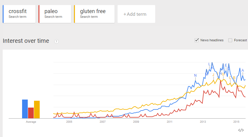 这个故事中“原始饮食”的部分或许更加引人注目。看看谷歌趋势对2000年代初到2015年左右几个关键术语的分析: