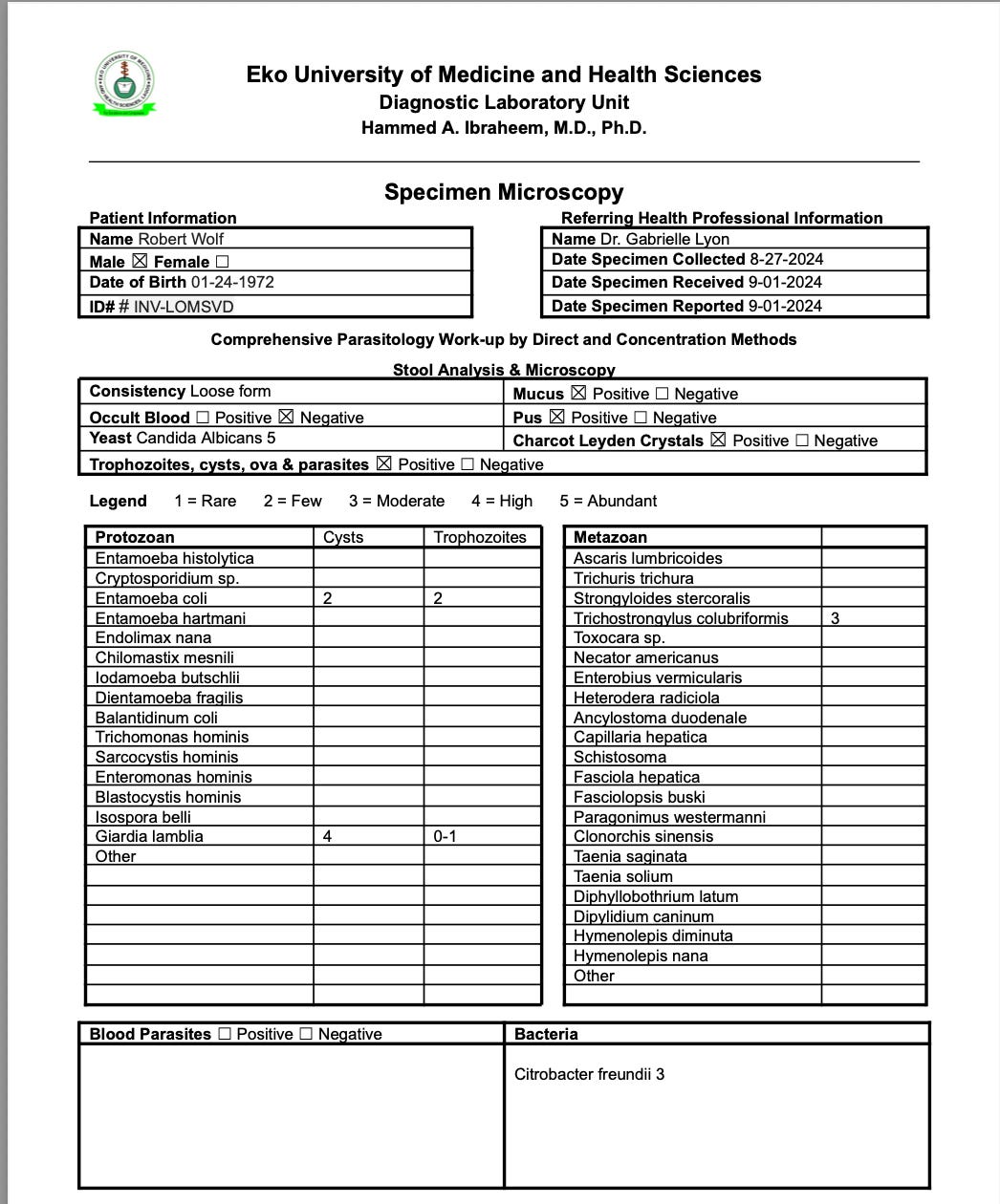 2024年7月初,我结束了一次锻炼,拍了张自拍。看起来还不错。虽然体重下降了很多,但肌肉依然有,如果说肠胃彻底崩溃有什么好处的话,那就是保持身材苗条比较容易!我发这张照片既是为了督促自己,也是想提醒大家,即使一个人看起来状态很好,他们也可能面临着巨大的挑战。我收到了各种各样的回复,但最有可能救了我一命的是我的好朋友加布里埃尔·里昂医生主动联系我,想弄清楚到底是怎么回事。我们通了电话,我详细地解释了我的情况,包括所有令人不快的细节。我解释说,我做了肠道菌群的常规检查(O&P-Ova 和寄生虫检测……这项检查的误差率在50%到70%之间)。我还做了最顶尖的“功能医学”筛查,虽然我的肠道菌群显然一团糟(多样性低,有害菌比例高),但并没有发现什么明显的异常。莱昂医生怀疑我可能得了一种很常见的病,寄生虫感染。她嫁给了一位退役的海豹突击队员,并在这个群体中做了很多工作。这些队员会被派往非常艰苦的环境。他们不得不吃不新鲜的食物,喝不干净的水,很多人出海时都像金刚狼一样精力充沛,但部署回来后却患上了各种各样的肠道疾病、自身免疫性疾病和其他健康问题。莱昂医生怀疑我之前做的所有常规和功能医学检查都漏掉了一些微生物,这些微生物正在慢慢地把我磨成粉末。我们安排了粪便检测,费用高得惊人,因为样本必须在48小时内从我家送到非洲!莱昂医生发现,美国以外的一些大学和检测实验室在检测这些微生物方面比美国使用的传统方法要有效得多。