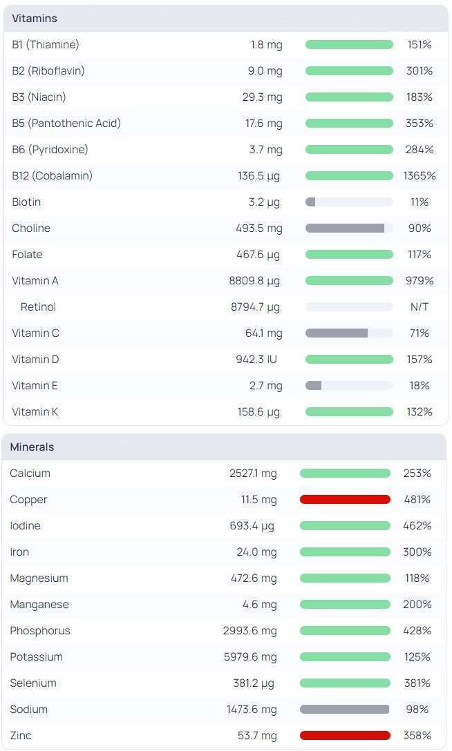 这是微量元素(维生素和矿物质)。除了生物素、维生素 E 和 K2 之外,一切都恰到好处。然而,肝是生物素、维生素 E 和维生素 K2(长链 MK)的重要来源。所以我觉得至少 30 天里已经涵盖了一切。铜和锌的含量都很高,但相互平衡,身体可以下调对足够营养物质的吸收。