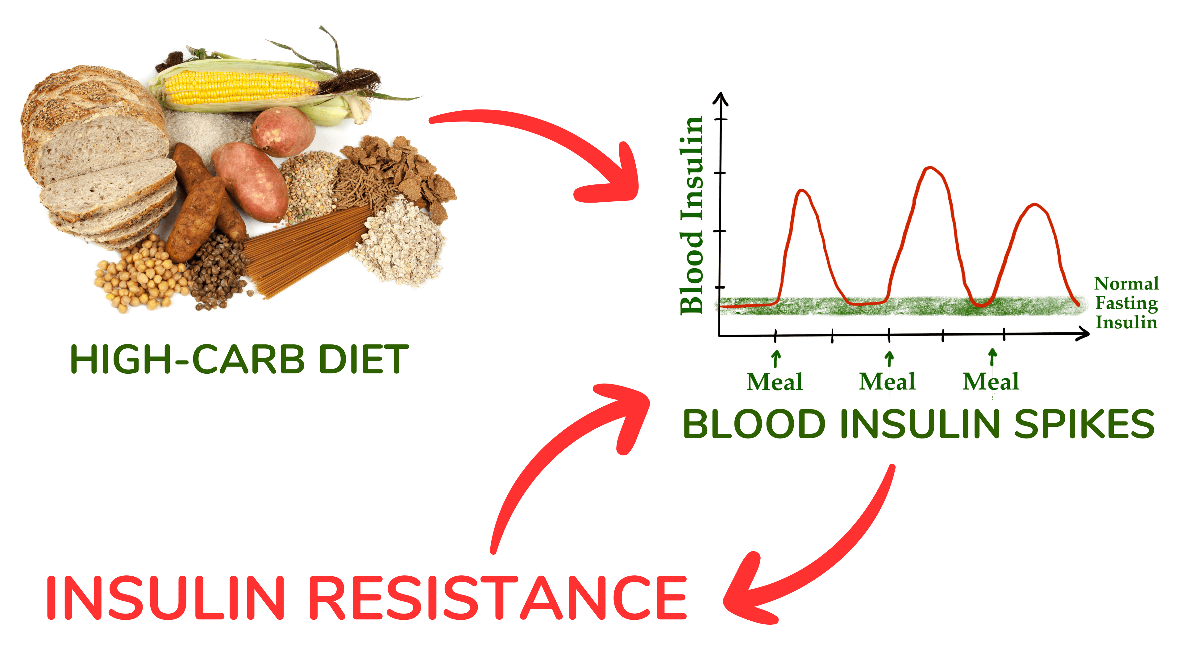 为此,首先研究胰岛素水平升高(高胰岛素血症)是否会导致胰岛素抵抗,然后查阅有关高碳水饮食是否确实会导致胰岛素抵抗的科学文献,以及相反的,低碳水饮食是否会改善胰岛素敏感。