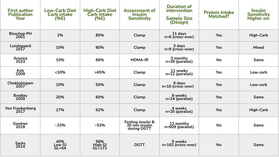 有几项规模非常小的研究(Bischop中 n=6, Lundsgaard中 n=9 ,Chokkalingam中 n=10 ),持续时间也很短(11 天、3 天和 6 天)。然而,这些都是交叉设计研究,意味着每个参与者都完成了每个饮食干预阶段,因此可以直接与自己进行比较。所有三项研究都采用了胰岛素敏感的金标准测量方法,即高胰岛素正常血糖钳夹。最后,在所有三项研究中,参与者在高碳水饮食条件下摄入的碳水化合物至少是低碳水饮食条件下的五倍,即高碳水和低碳水饮食条件下的碳水化合物摄入量存在很大差异。