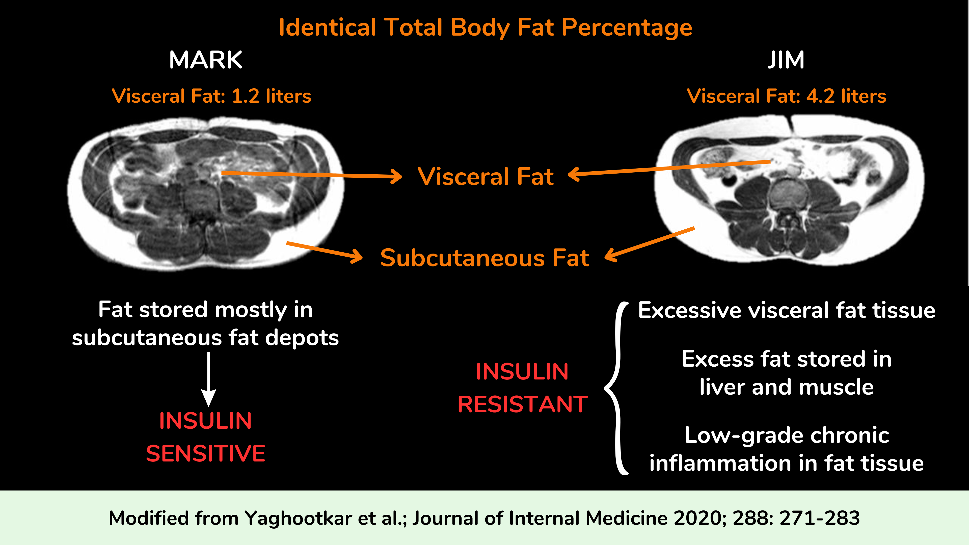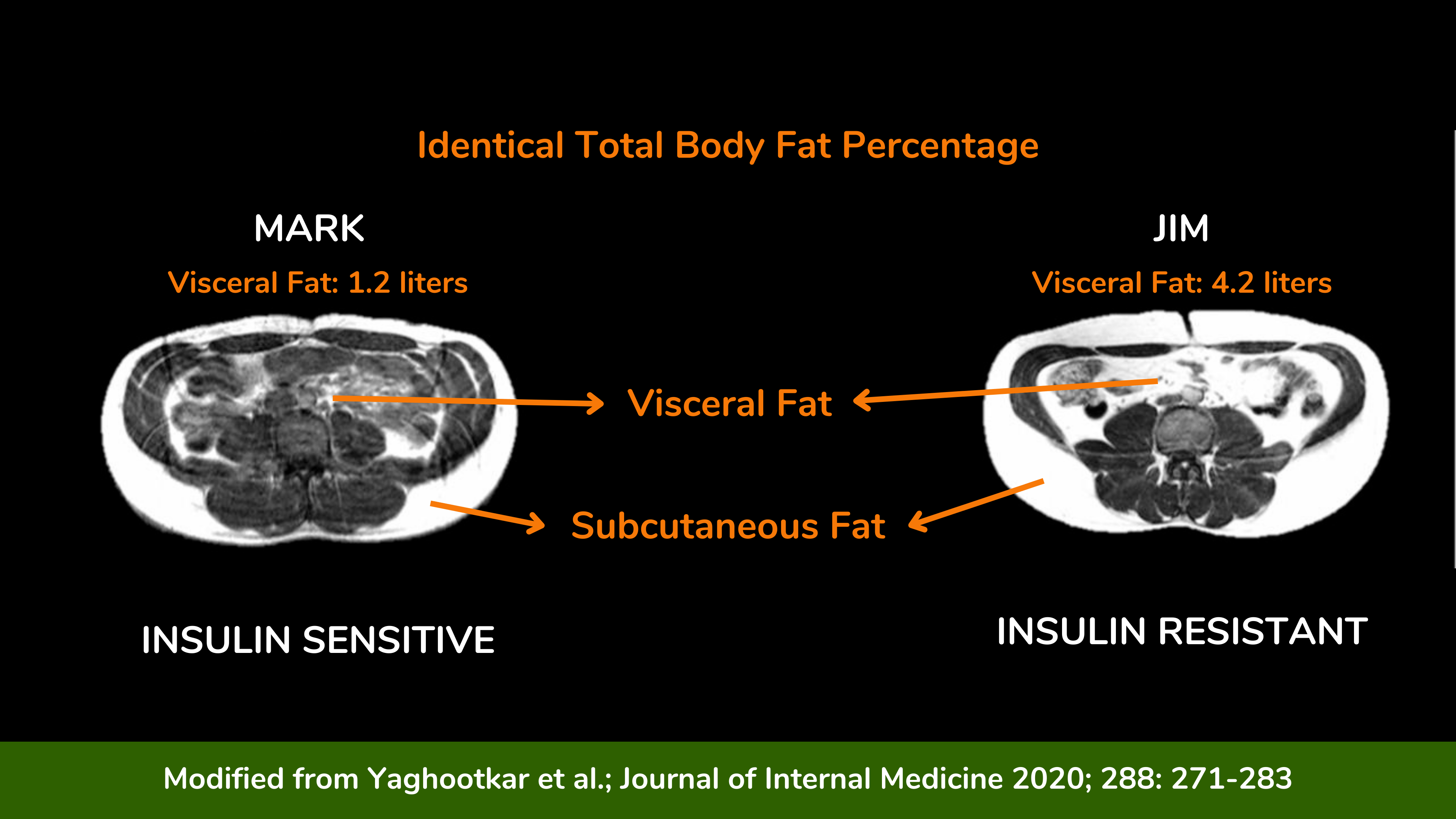 同样,该文献并未将高胰岛素血症与胰岛素抵抗完美联系起来。例如,至少有一篇出版物表明,手术切除胰岛素瘤可以明显减少内脏脂肪量。这表明胰岛素瘤可能在内脏脂肪的积累中发挥了作用,并且由于内脏脂肪被认为是胰岛素抵抗的关键决定因素,因此目前不能排除高胰岛素瘤患者至少部分是胰岛素抵抗的可能性。内脏脂肪量增加的结果,而不是高胰岛素血症本身。这是因为其他已发表的胰岛素瘤患者研究与体脂量的一般指标(例如体重指数(BMI))相匹配,但没有测量内脏脂肪量,因此无法评估胰岛素瘤患者的胰岛素抵抗增加到什么程度。这些患者的原因可能是内脏脂肪量增加。